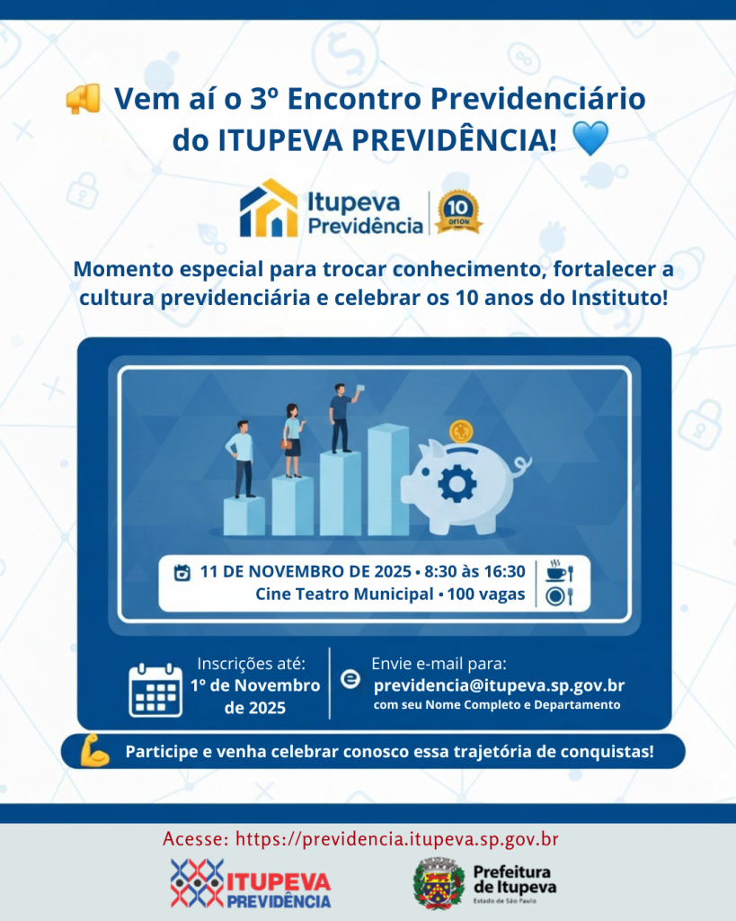 No dia 11 de novembro de 2025, das 8h30 às 16h30, no Cine Teatro Municipal “Dr. Aluízio Rebello de Araújo”, realizaremos nosso 3º Encontro Previdenciário — um momento especial para trocar conhecimento, fortalecer a cultura previdenciária e celebrar os 10 anos do Instituto! 🎉