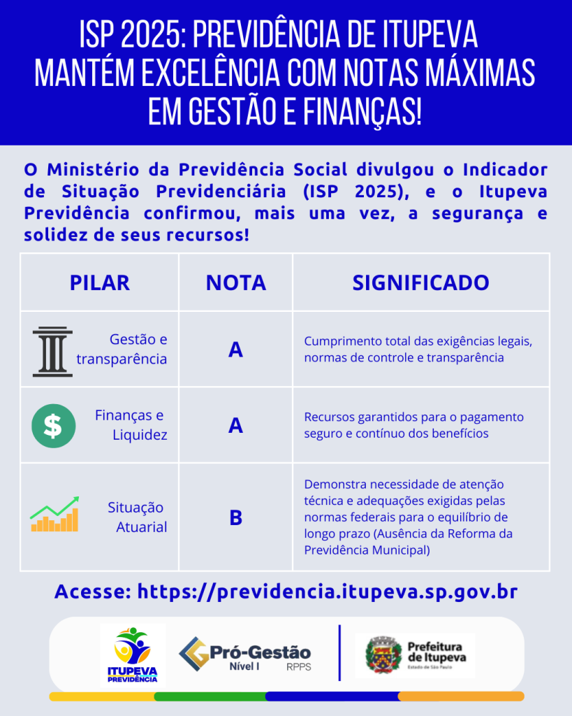 O Instituto de Previdência dos Servidores Municipais de Itupeva informa a divulgação do Indicador de Situação Previdenciária (ISP) 2025 pelo Ministério da Previdência Social. O resultado atesta a excelente gestão administrativa e financeira do Regime Próprio de Previdência Social (RPPS) de Itupeva.