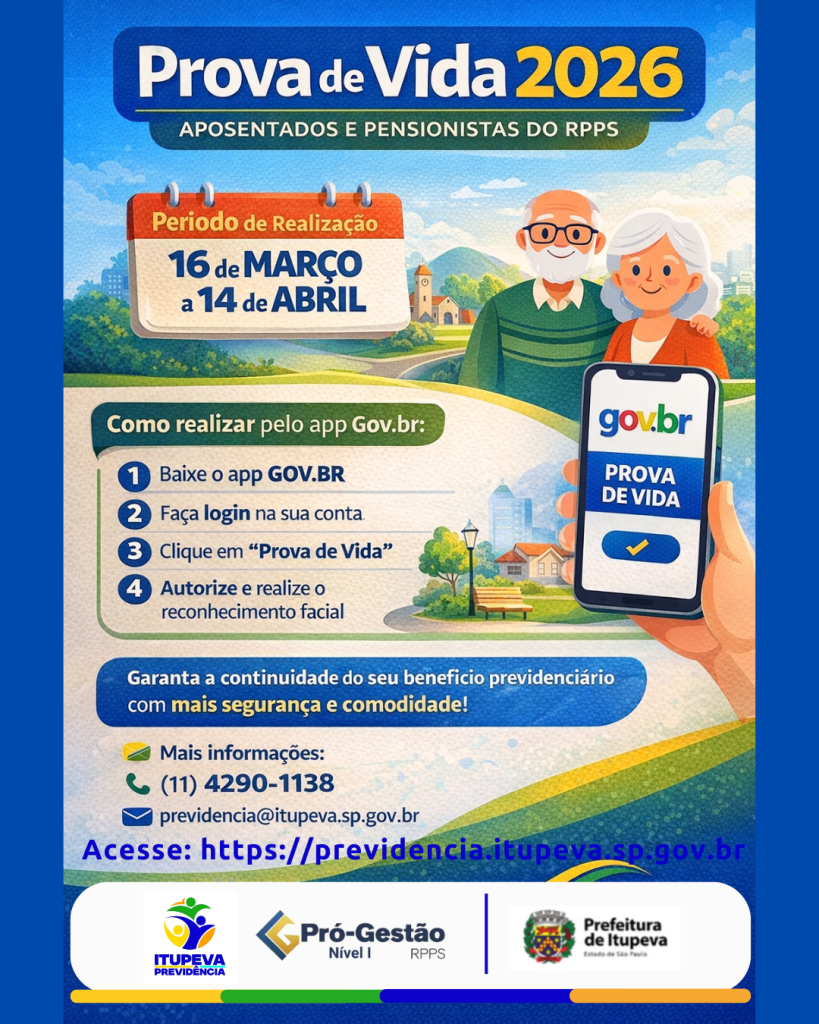 Itupeva Previdência realizará, entre os dias 16 de março e 14 de abril de 2026, o procedimento anual de Prova de Vida dos aposentados e pensionistas vinculados ao Regime Próprio de Previdência Social (RPPS) do município.